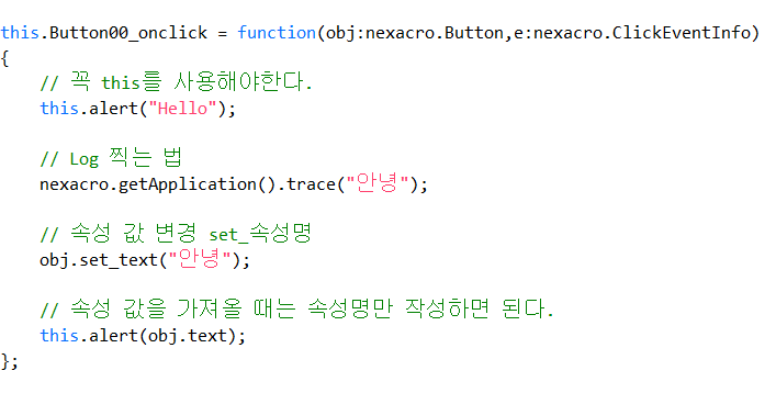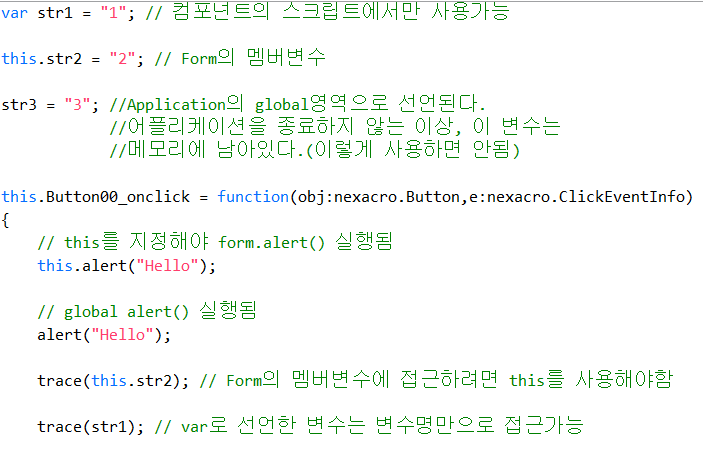 넥사크로플랫폼은 모든 Method, Propertis, Event 사용 시에는 Scope(this)를 반드시 적어줘야 한다.