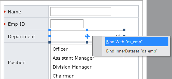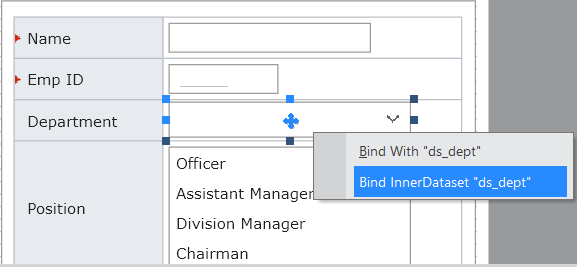 목록형 컴포넌트에 데이터를 바인딩 할 때는 먼저 목록 데이터가 들어있는 dataset을 바인딩 ( Bind InnerDataset )