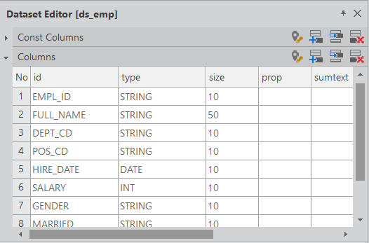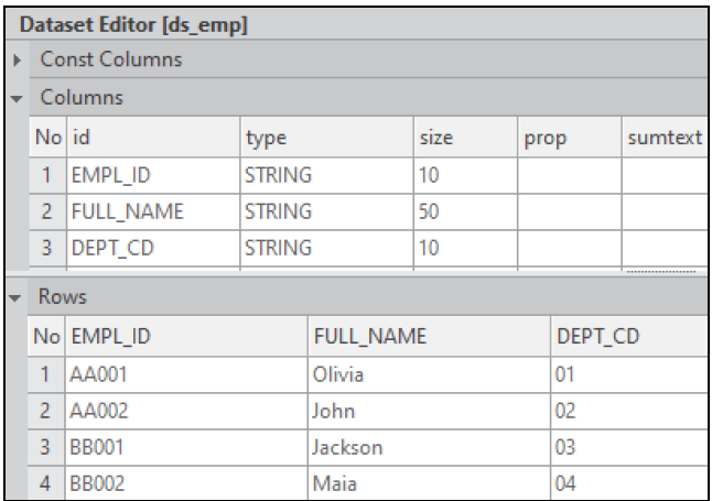*Dataset 컴포넌트에 DB나 서버 구축이 되어 있지 않아도 데이터(더미데이터)를 만들 수 있다.