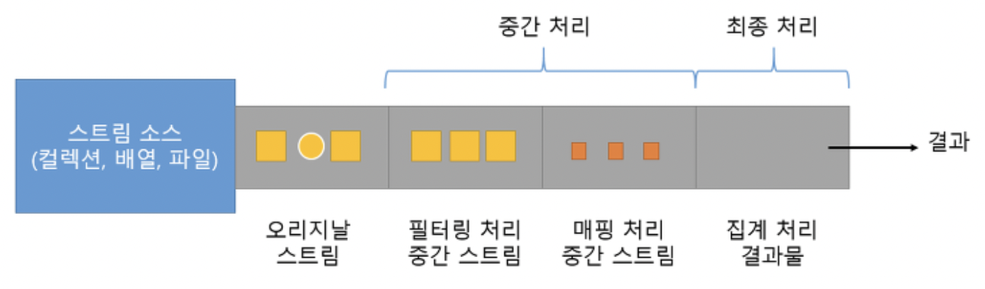 이 스트림에서 다시 중간 처리 메소드를 호출해서 파이프라인을 형성하게 된다.